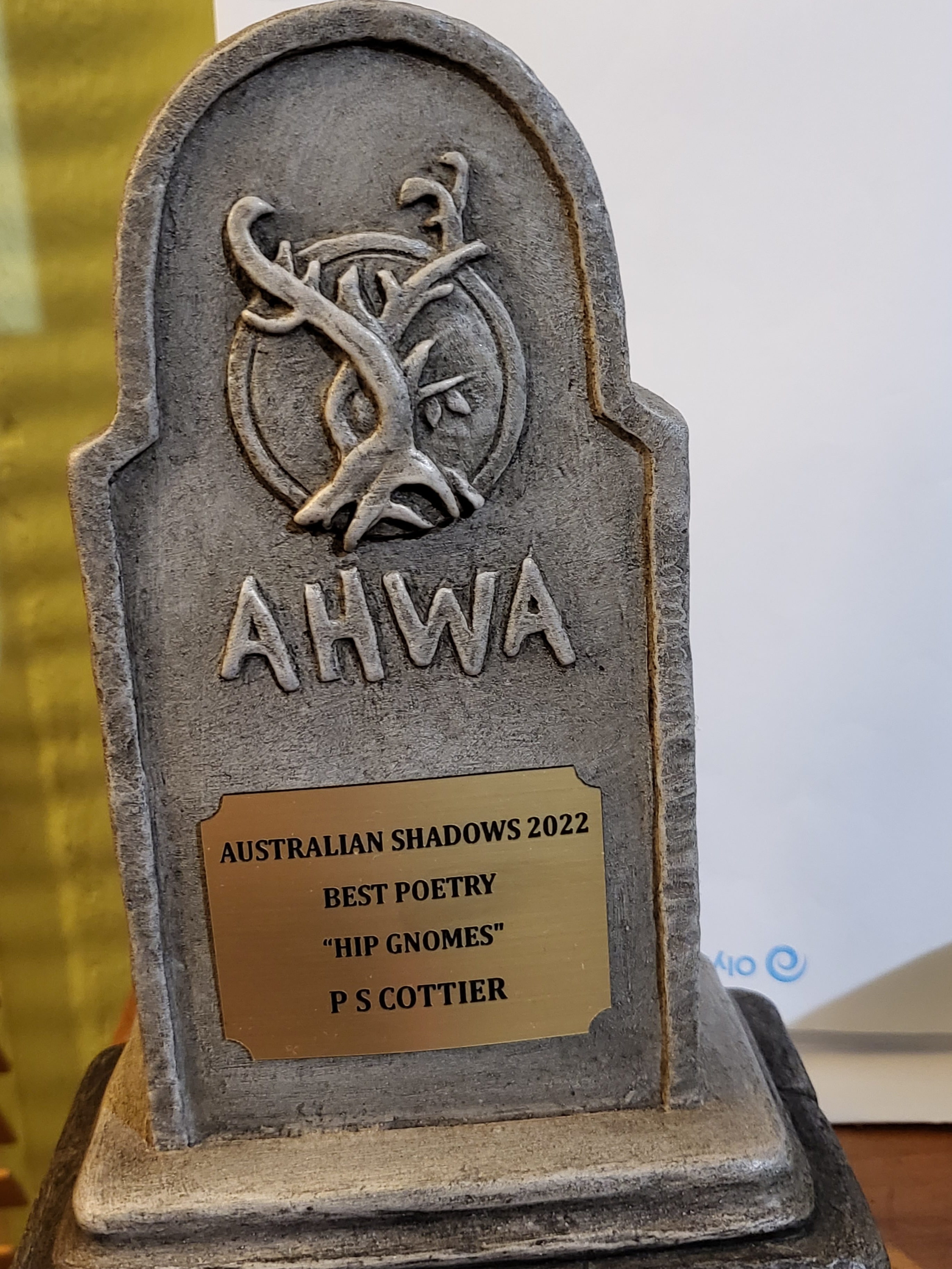 Very happy that my poem “Hip gnomes” was just awarded the Australasian Horror Writers Association Shadows Award in the poetry category for 2022. A great trophy! And everyone needs a tombstone arriving just before Halloween.