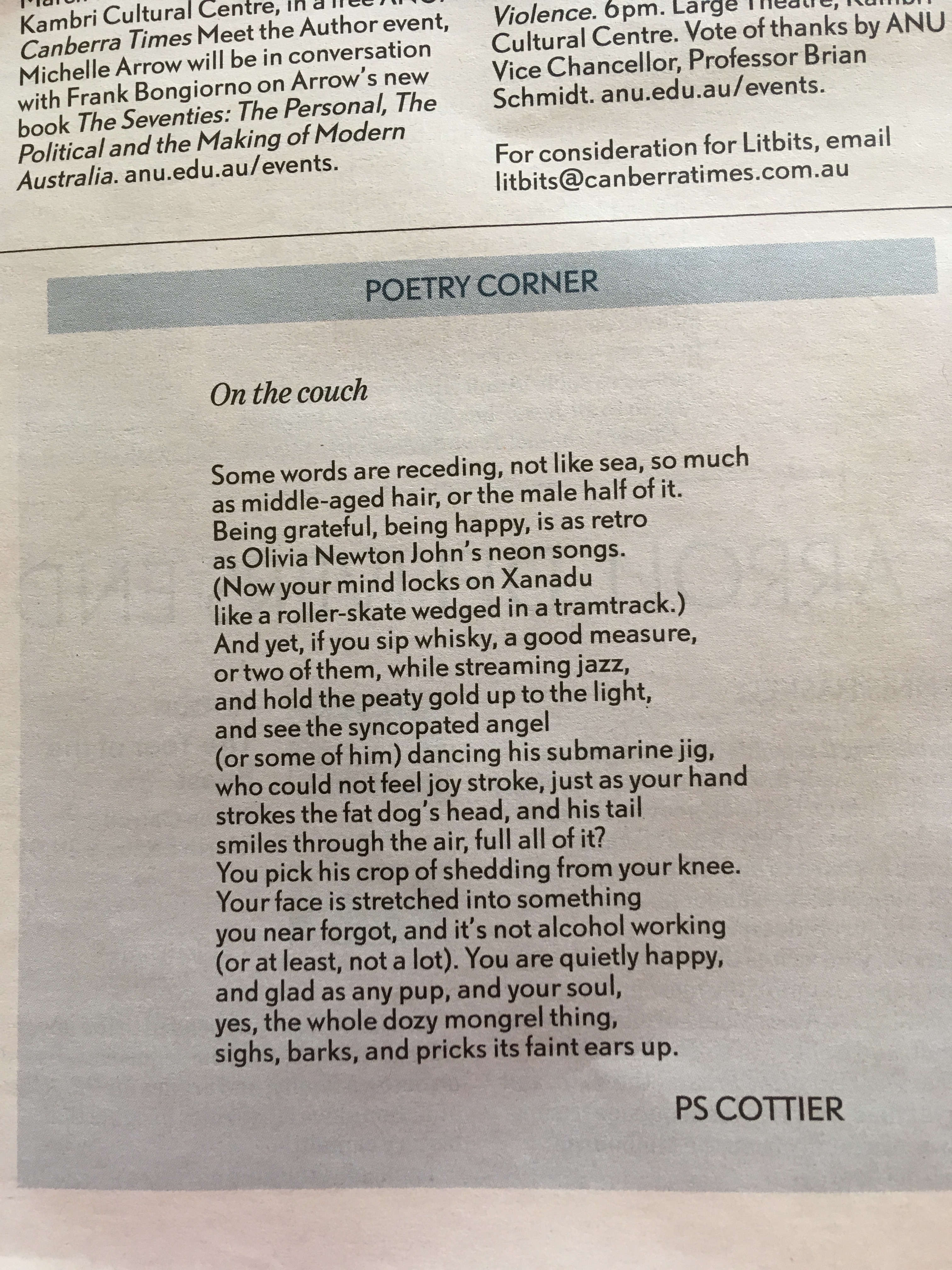 This poem was published last weekend in The Canberra Times, one of the few newspapers to still have a regular ‘corner’ for poetry. You can see ‘corner’ in terms of a place to hide, or the place where boxers go between rounds. I prefer the latter idea!